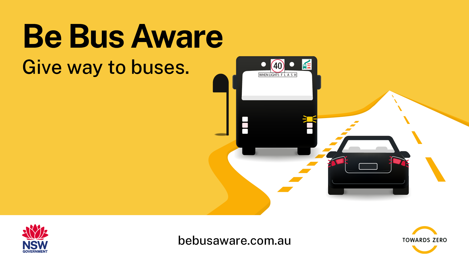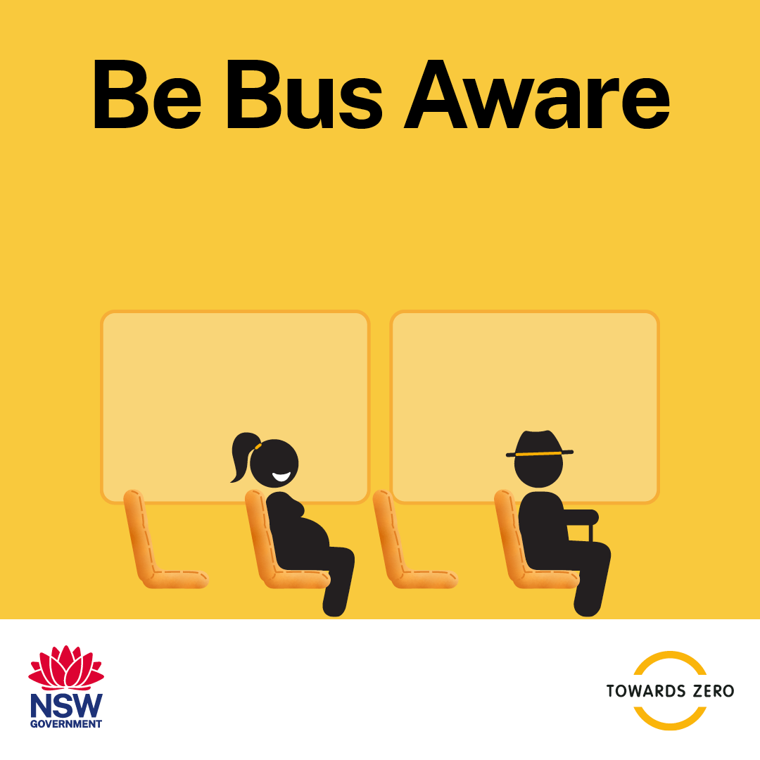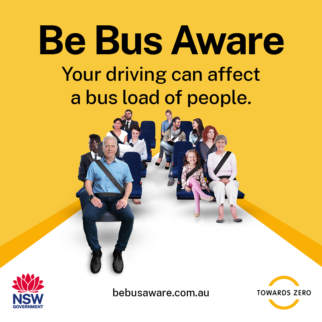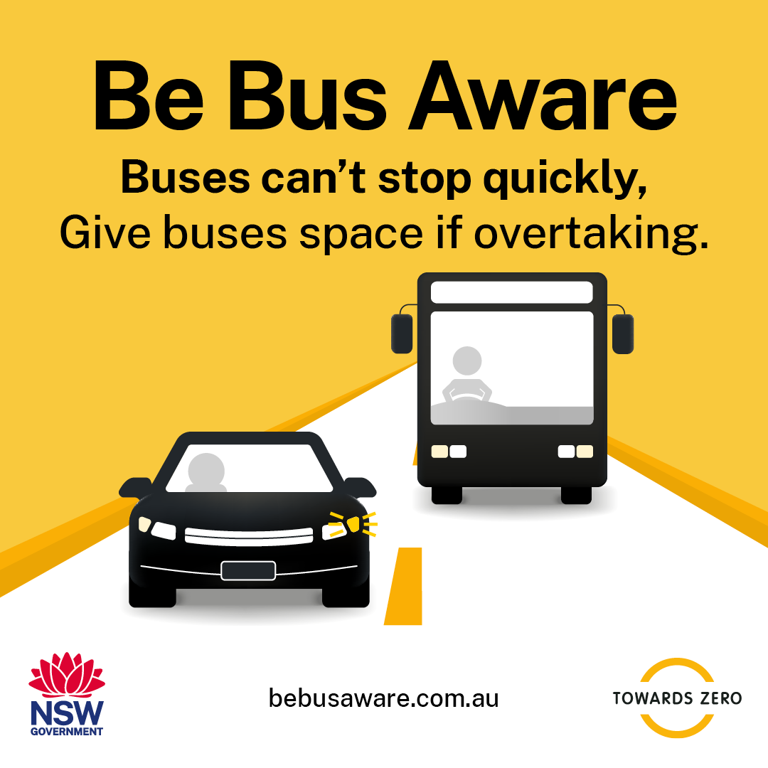 Some bus stops in rural and regional NSW do not have signs or other infrastructure. Take extra care when driving in these areas. Be aware of children crossing or about to cross the road and slow down to 40km/h when bus lights flash. #BeBusAware
