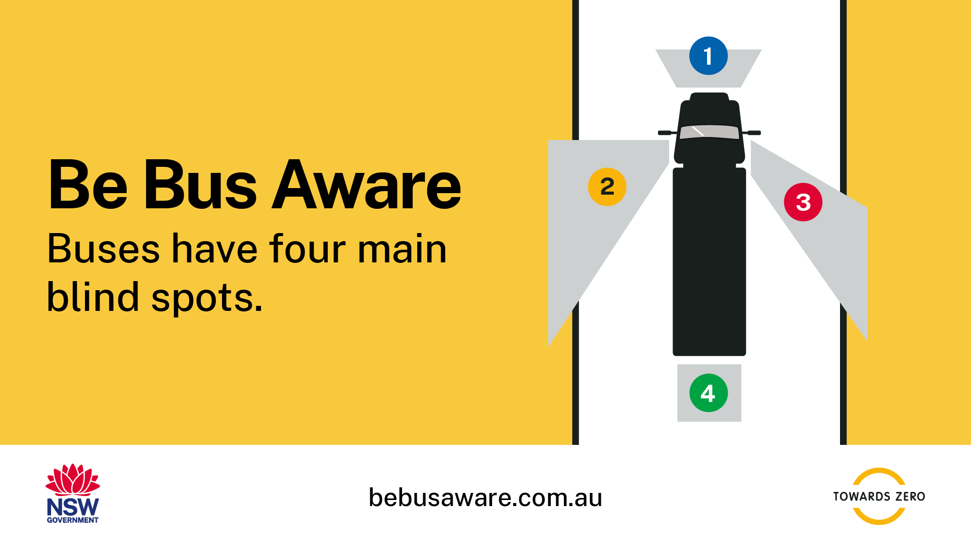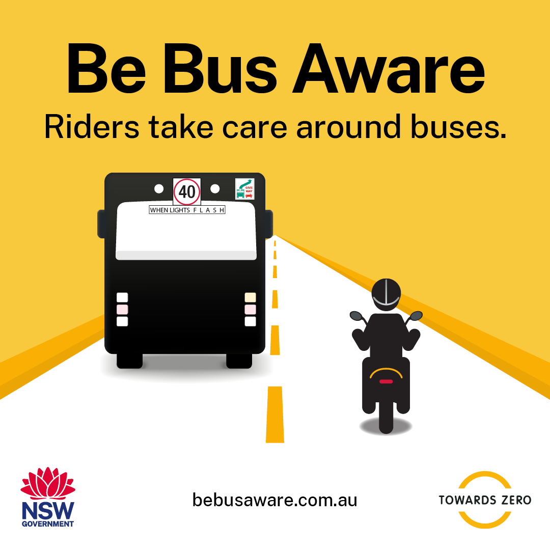 When riding around buses and other heavy vehicles, avoid lane filtering and be aware of a bus’s blind spots. Give buses space. Road safety is a shared responsibility. #BeBusAware |