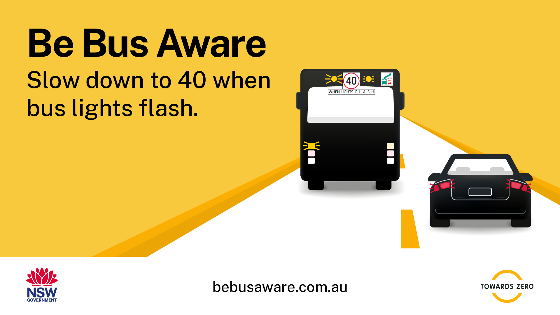 Unless a lower speed limit applies, by law motorists must slow down to 40km/h when bus lights flash, as this means the bus is picking up or dropping off school children who may be crossing or about to cross the road. #BeBusAware |